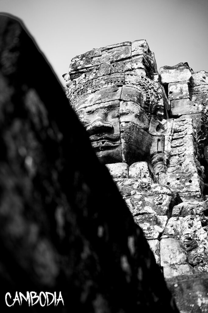 Ein aus Stein gehauenes, monumentales Antlitz blickt mit geschlossenen Augen aus den Ruinen von Angkor. Die verwitterten Strukturen und feinen Reliefs verschmelzen zu einer Einheit aus Geschichte und Stille, während eine dunkle Steinkante im Vordergrund für Tiefe sorgt.